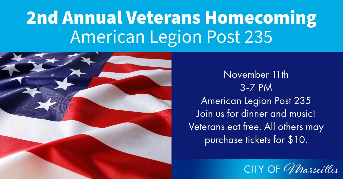 November 11th 3-7 PM American Legion Post 235 Join us for dinner and music! Veterans eat free. All others may purchase tickets for $10.