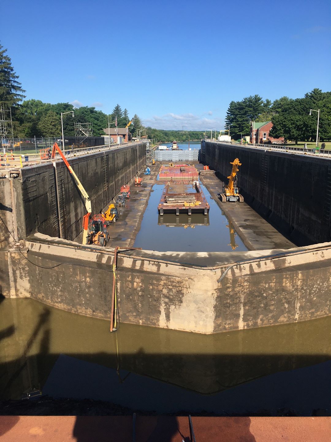 The 2020 Illinois Waterway Consolidated Lock Closure rolls on as Marseilles Lock in Marseilles, Illinois, was dewatered over the weekend. Once the chamber was pumped down, equipment staging began for the upper miter gate replacement that will take place at the site. (Taken from the Facebook page of the U.S. Army Corps of Engineers)
