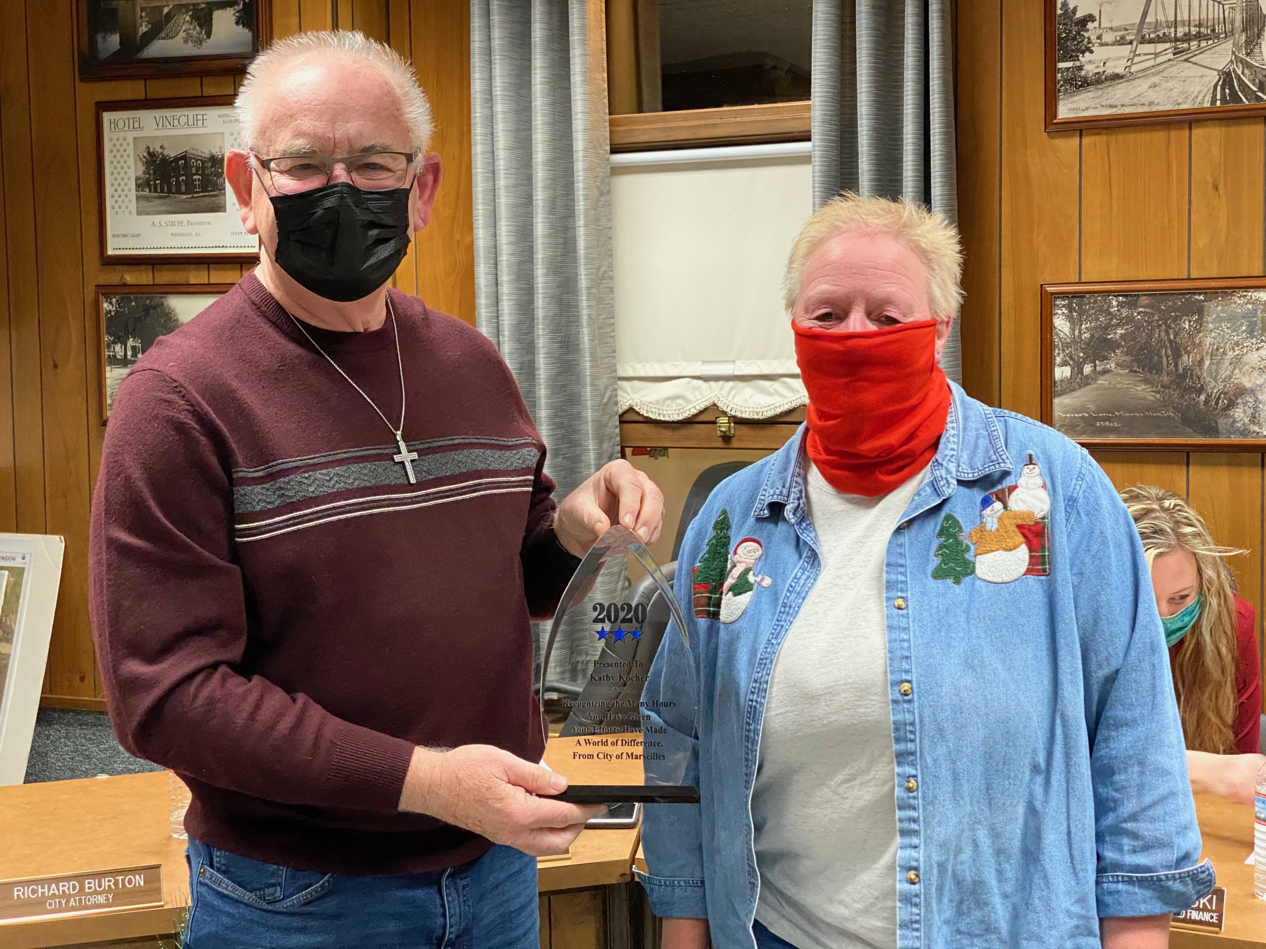 Tonight at the last City Council meeting of 2020 the City of Marseilles found it only fitting to present Kathy Kocher with an award of appreciation for all the events she and her committee, The Marseilles Tourism, and Park Committee, have brought to Marseilles. From parades to fairs to Light Up Knudson Park, her love for the town is felt and appreciated! So thanks again for all you have brought us, especially this holiday season, in a year that presented so many challenges for events!
