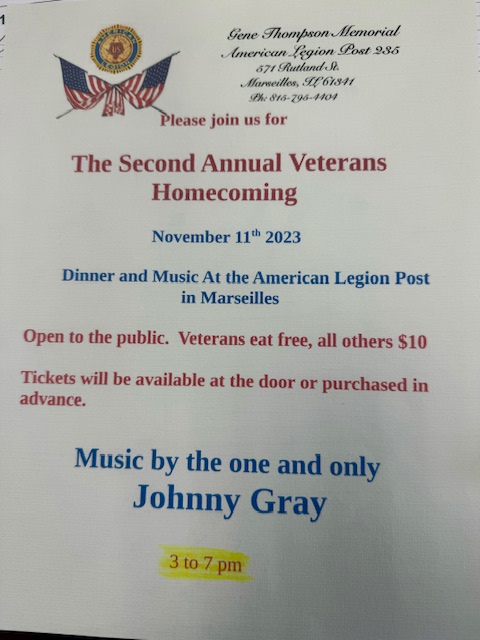 November 11th 3-7 PM American Legion Post 235 Join us for dinner and music! Veterans eat free. All others may purchase tickets for $10.