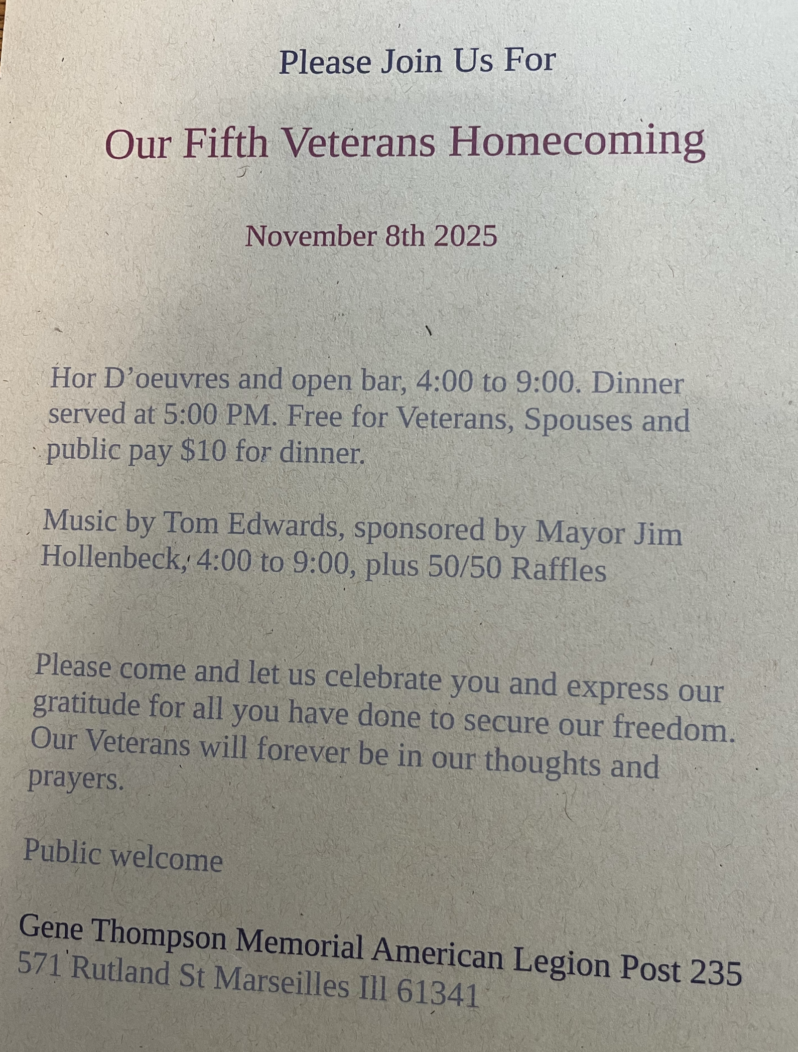 The Marseilles American Legion Post 235 is hosting a Veterans Homecoming the 8th of November. The public is welcome. Hors d’oeuvres and open bar at 4:00 to 9:00. Free for Veterans and spouses, $10 for all others, for dinner.