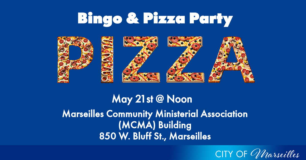 Save the date for a Bingo and Pizza Party at MCMA Community Center on May 21st at Noon hosted by Bridges Senior Center and Marseilles Nursing Service! This will be held at the Marseilles Community Ministerial Association (MCMA) Building 850 W. Bluff St., Marseilles.