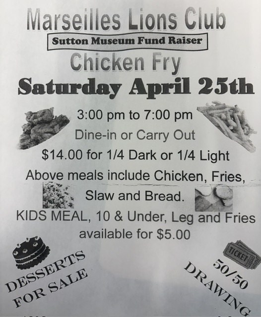 The Marseilles Lions Club is hosting a chicken fry on April 25th from 3 – 7 PM. Dine in or carry out. $14 for 1/4 dark or 1/4 light. Meals include chicken, coleslaw, fries and bread. Kids 10 and under $5 for a chicken leg and fries. Desserts will be for sale plus a 50/50 raffle.