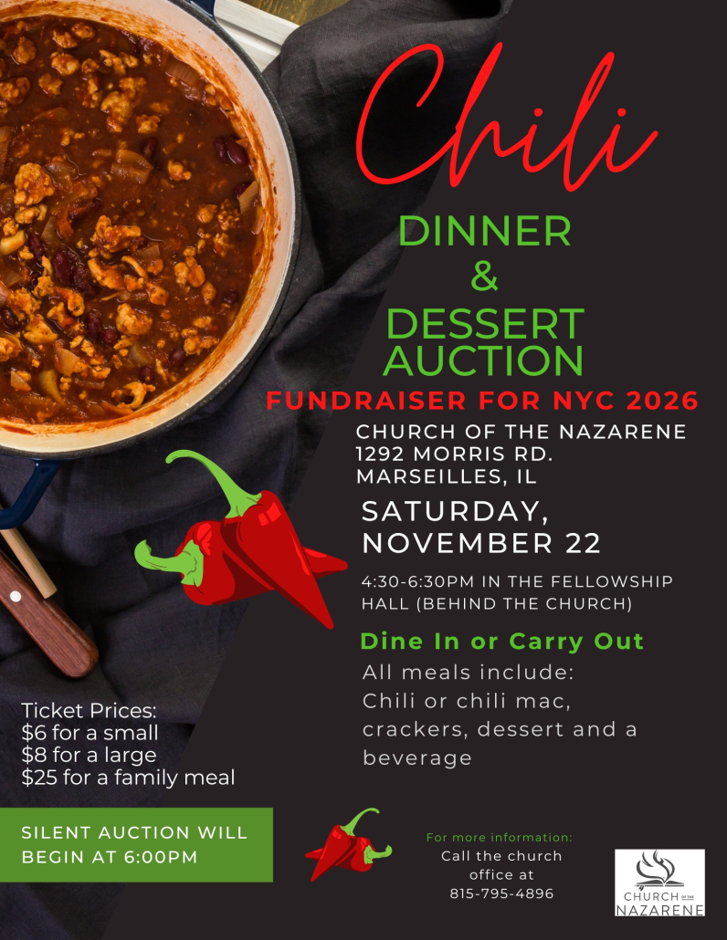 Chili Dinner/Dessert Auction on Saturday, November 22 from 4:30-6:30pm in our fellowship hall (behind the church). THIS IS A FUNDRAISER FOR NAZARENE YOUTH CONFERENCE 2026.