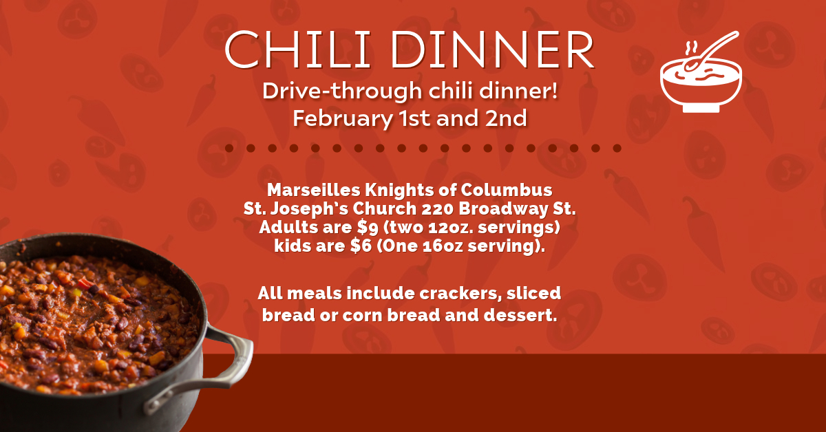 Marseilles Church of the Nazarene 1292 Morris Rd., Marseilles, ILChili Dinner/Dessert Auction on Saturday, November 22 from 4:30-6:30pm in our fellowship hall (behind the church). THIS IS A FUNDRAISER FOR NAZARENE YOUTH CONFERENCE 2026.Dine In or Carry OutTickets: $6 for a small, $8 for a large and $25 for a family meal which consists of 2 large and up to 4 small servings.All meals