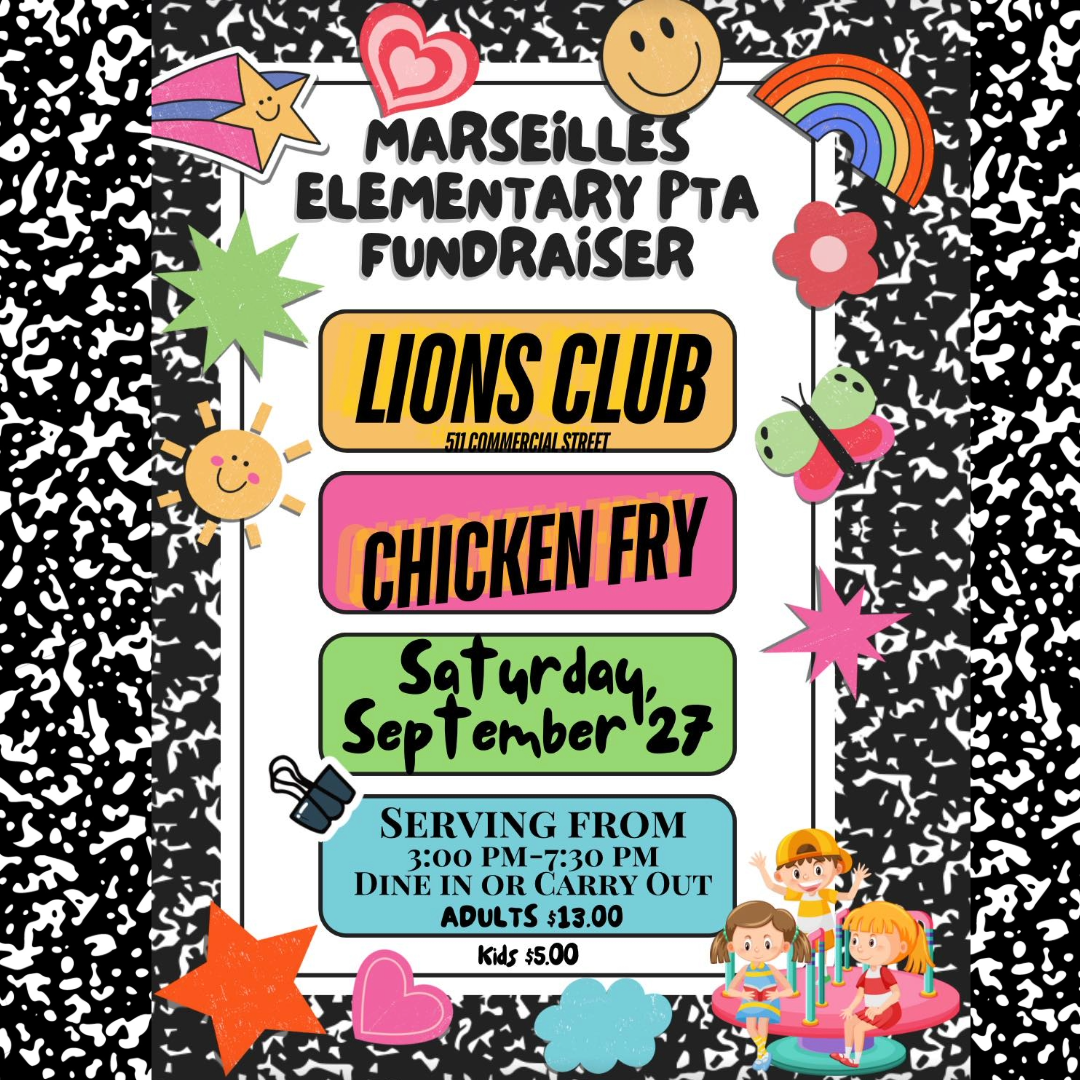 Support the Marseilles Elementary PTA at a chicken fry on September 27th! Dine in or carry out. Serving from 3 PM – 7:30 PM at the Lions Club, 511 Commercial St. in Marseilles.