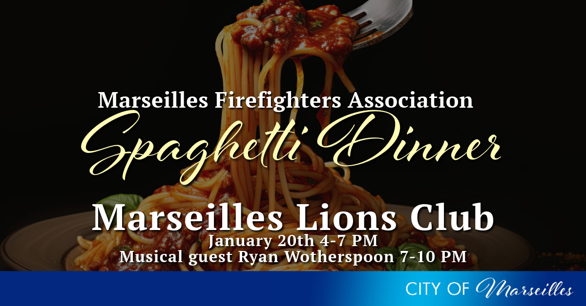 Join us Saturday, January 20th at the Marseilles Lions Club for an evening out sponsored by the Marseilles Firefighter’s Association and the Lions Club. From 4 PM – 7 PM, we will be serving a Spaghetti Dinner, and musical entertainment from 7 PM – 10 PM by Ryan Wotherspoon. Cost for the dinner is $12 for adults and $8 for kids under 12. The Lions club will be sponsoring games of chance throughout the evening.