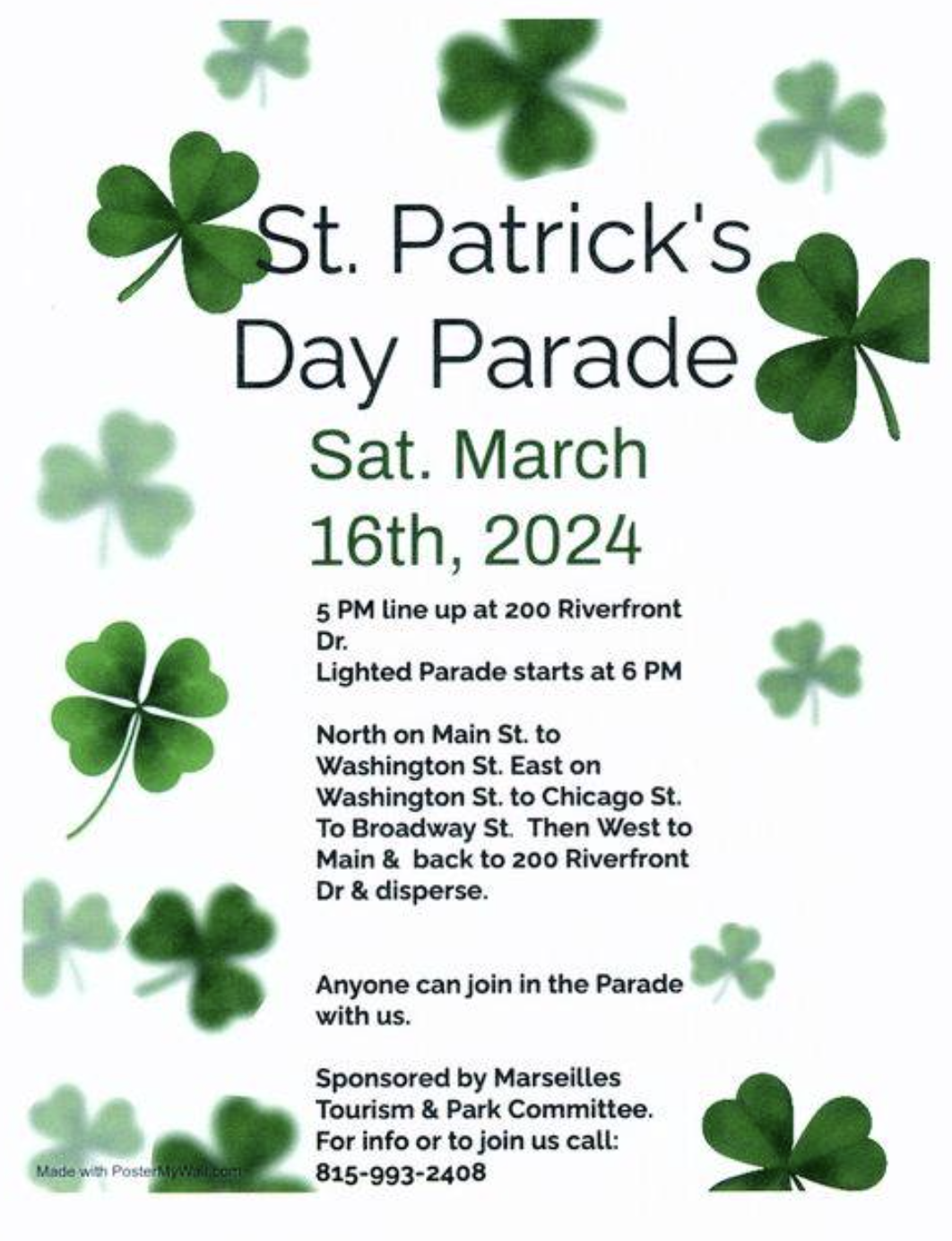 St. Patrick’s Day Parade Saturday, March 16th! 5 PM lineup at 200 Riverfront Dr. Sponsored by the Marseilles Tourism and Parks Committee Call 815-993-2408 for info or to join in!