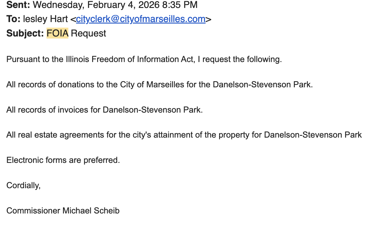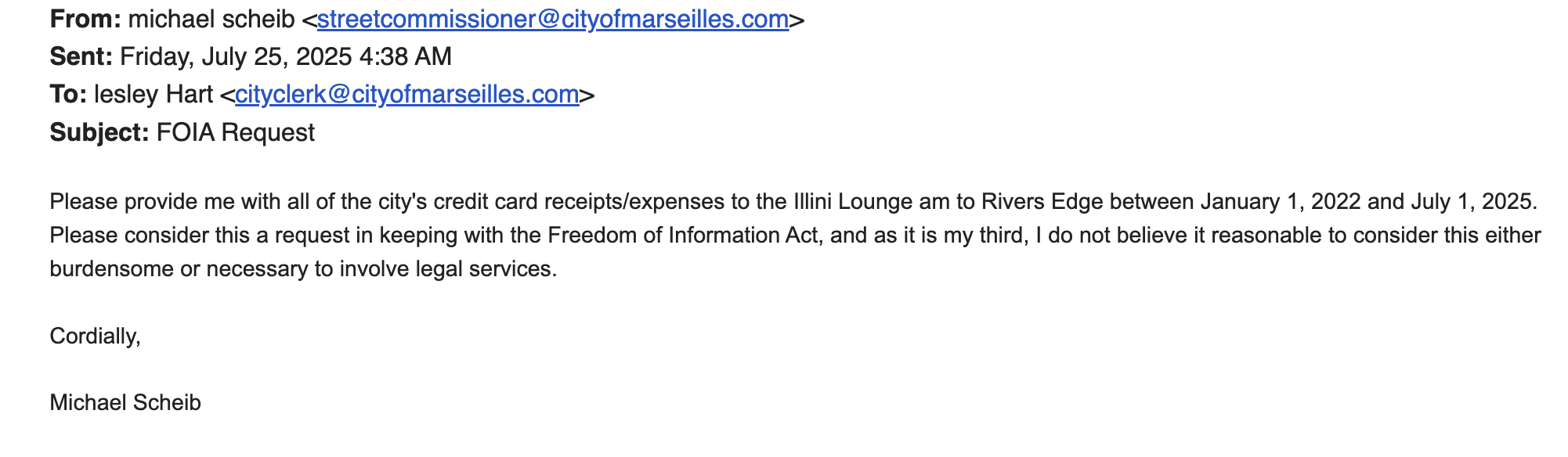 The information posted here is for informational purposes only and is based on public records provided to the City of Marseilles, IL. While efforts are made to ensure accuracy, we do not guarantee the completeness or correctness of this information. This page is continuously under construction and being updated, and will take some time to list all the FOIA requests and the requestors as well as costs to the taxpayers.