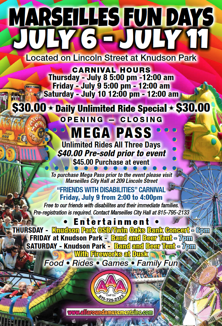 • 1pm: Fun Days Parade hosted by the Illinois River Area Chamber of Commerce will line-up at 12 Noon at Marseilles Elementary School. Step-Off at 1pm. Parade Route down Broadway St to Commercial St to the Ball Diamonds. Sign up/Chamber 815-795-2323