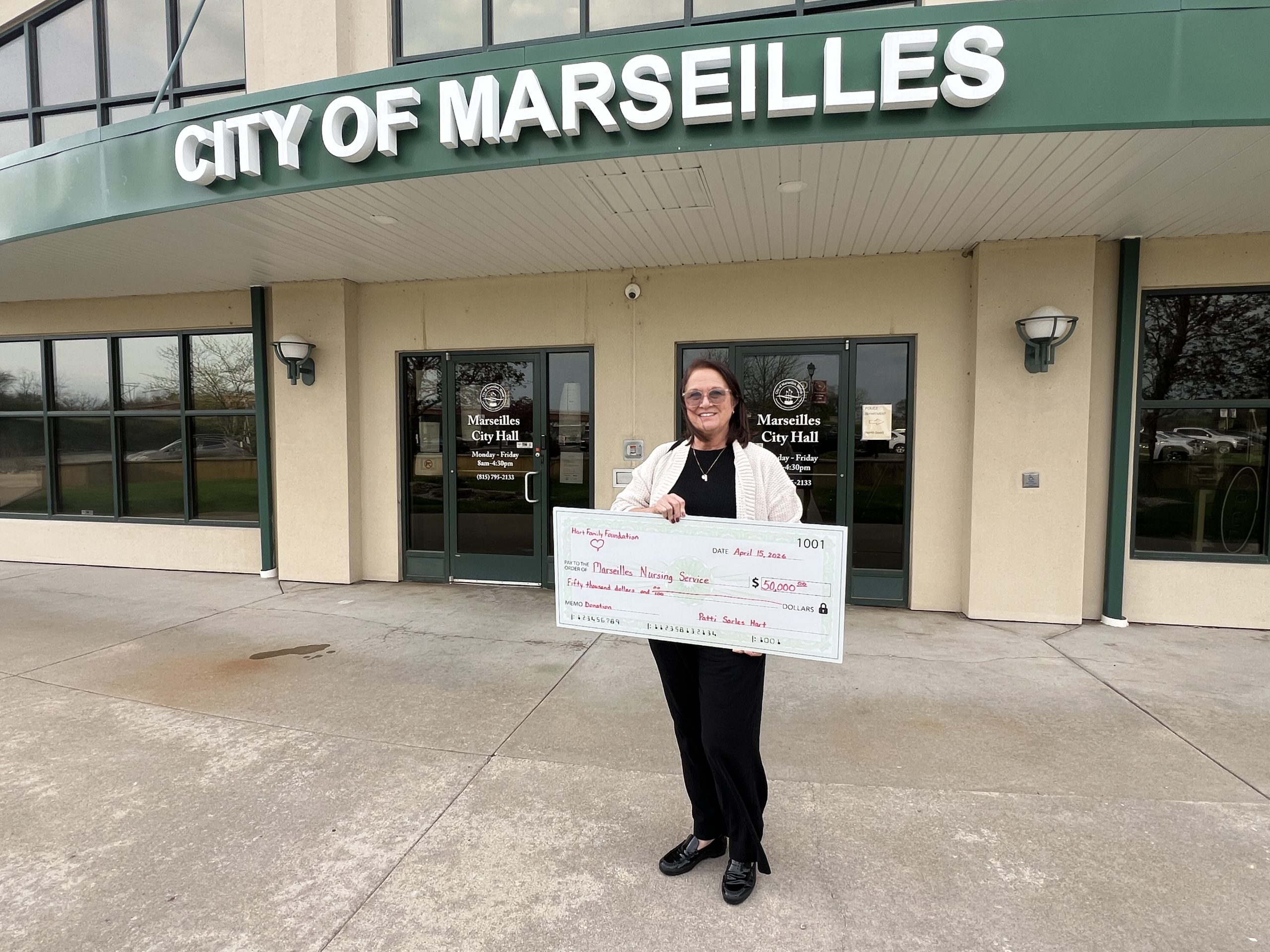 We love being able to share something so exciting and positive with you today. Patti Sarles Hart, born and raised in Marseilles and now residing in London, has presented the Marseilles Nursing Service with a significant donation of $50,000 a year for 3 years. The Marseilles Nursing Service provides cost-free services to the residents of Marseilles and is funded solely on donations.